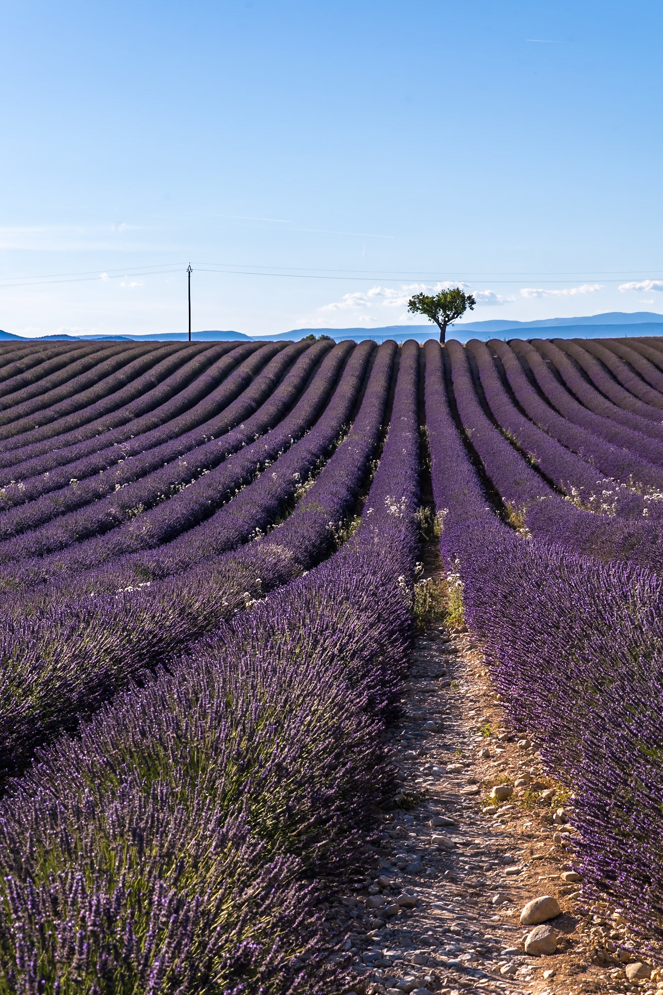 Sur le plateau de Valensole, les champs de tournesol côtoient souvent les champs de lavande offrant un spectacle superbe. La ligne jaune du champ de tournesol , l'avant plan constitué du champ de lavande et le ciel bleu profond sans nuage ont permis de structurer cette photo autour de ces lignes de couleur.